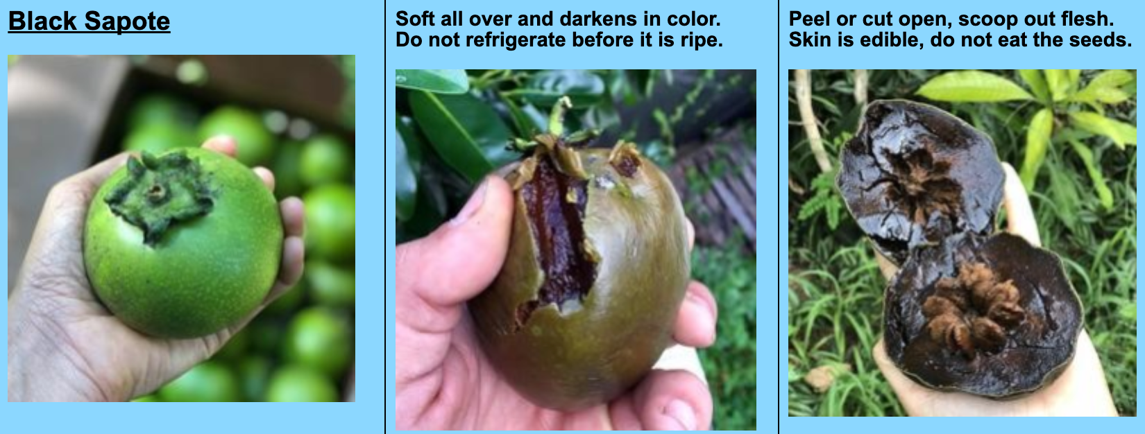 Flavor Profile: Black Sapote is known as the chocolate pudding fruit for its dark brown, custard-like flesh. This fruit has a light flavor with a rich texture. It is often eaten on its own or blended with dates to make a sweet, creamy “chocolate” pudding. You can also spread it on toast for a nutritious substitute to chocolate flavored hazelnut spread.