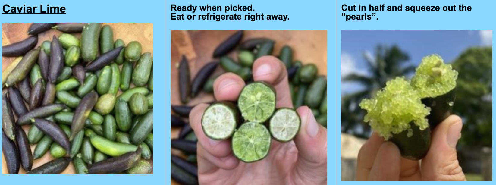 How To Eat: Caviar Limes arrive ripe and ready to eat! Finger limes also known as (vegan caviar limes) are a delightfully delicious treat that make a super satisfying pop when squeezed. We love eating the little “pearls” as is but they also taste amazing on top of other fruits like watermelon and papaya. Please be sure to refrigerate your finger limes upon arrival if you are not planning to consume them all right away.