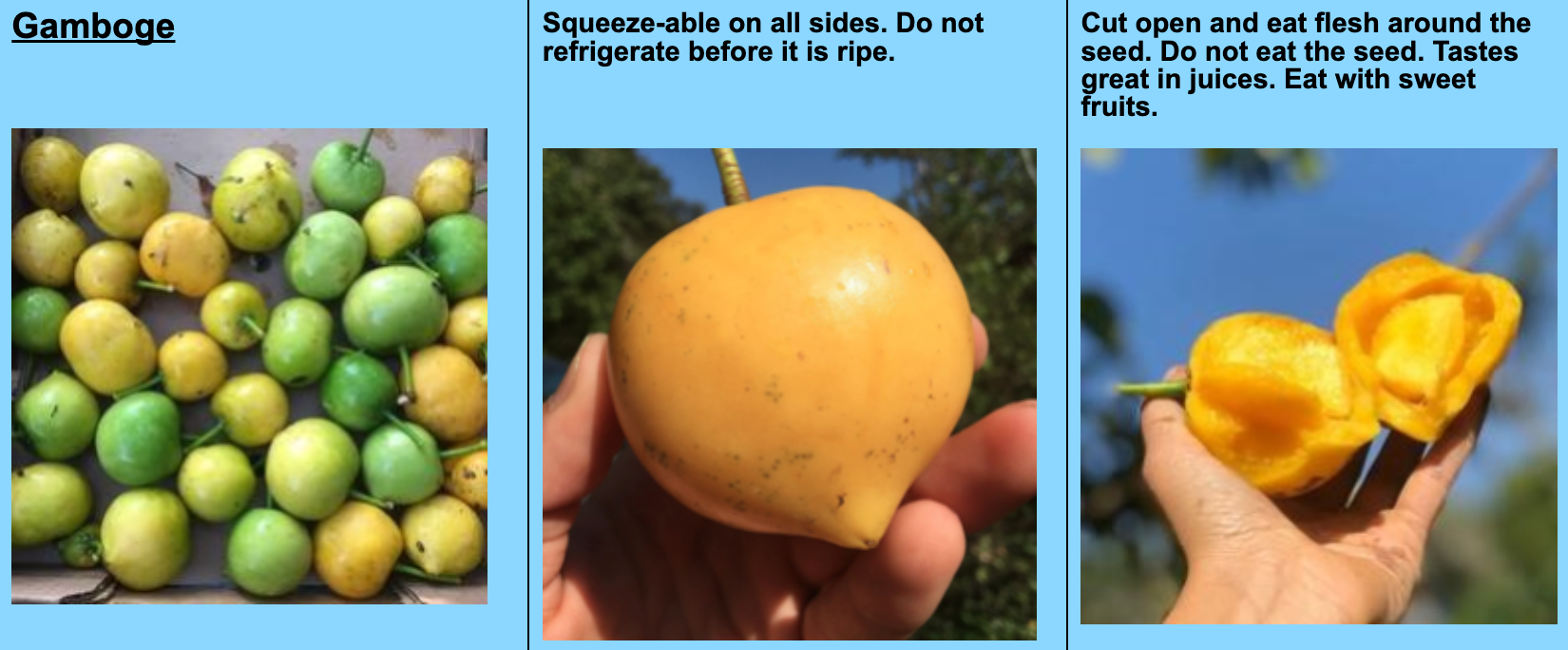 How To Eat: This fruit may need time to ripen after delivery. Ripen at room temperature of 70 degrees or above for optimal consumption. Ensure your Gamboge is squeeze-able on all sides, and when it is- enjoy!