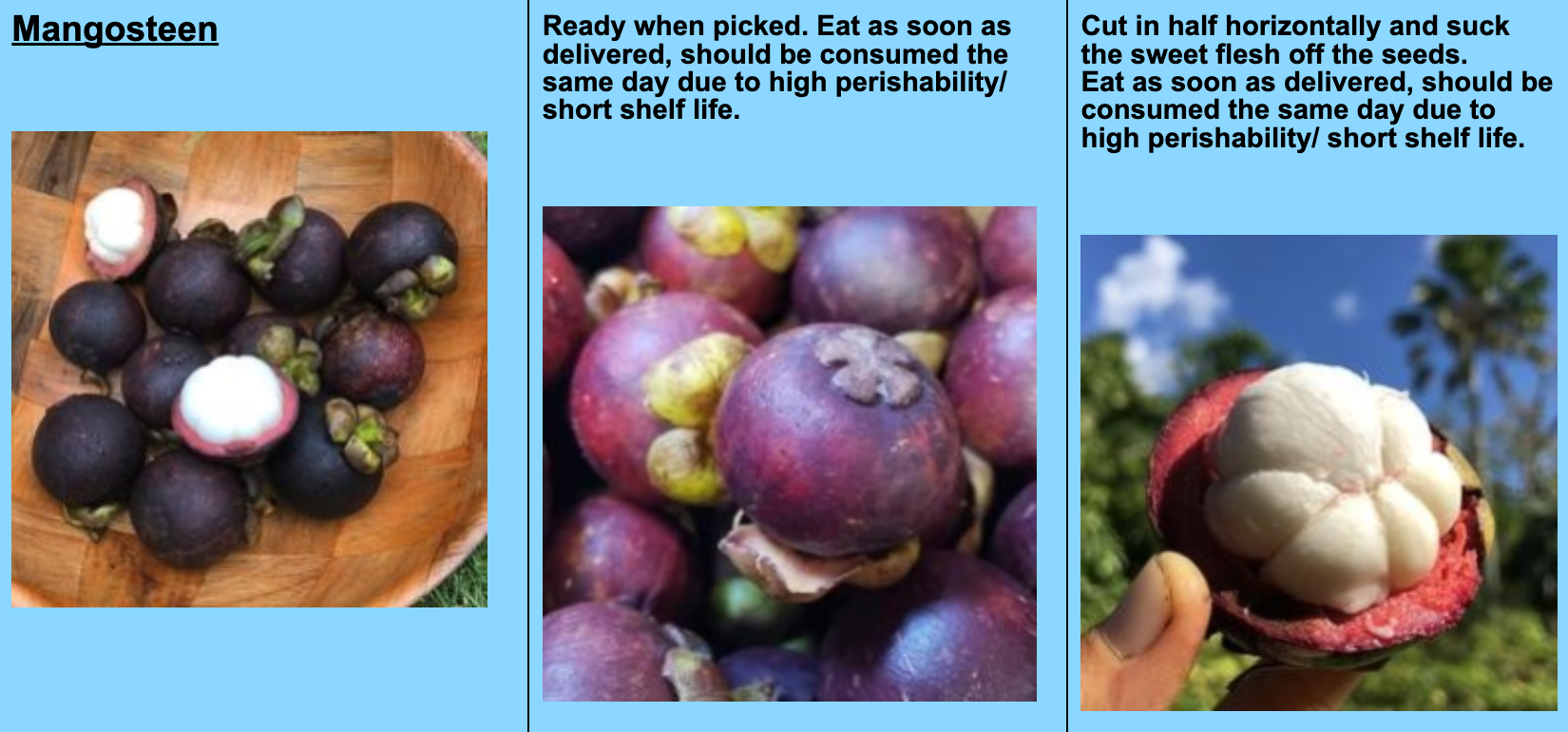 How To Eat: Mangosteen is a tree-ripened fruit that arrives ripe and ready to eat. Please be sure to eat your Mangosteen immediately on the date of arrival as this is a highly perishable fruit.