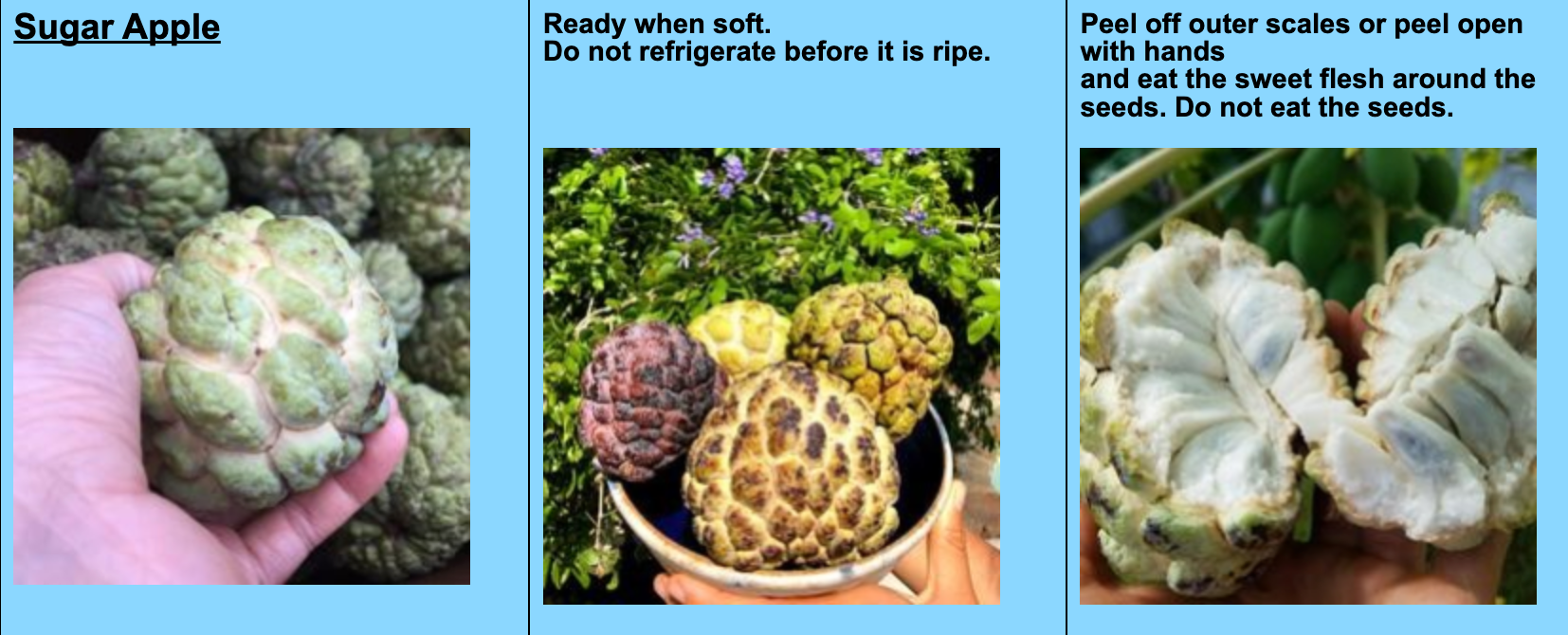 How To Eat: Extremely rare and limited availability. Purple sugar apple has a unique purple scaly skin outside. When ripe and soft, this fruit can be opened by hand by simply pulling in half. Avoid eating the skin and seeds.