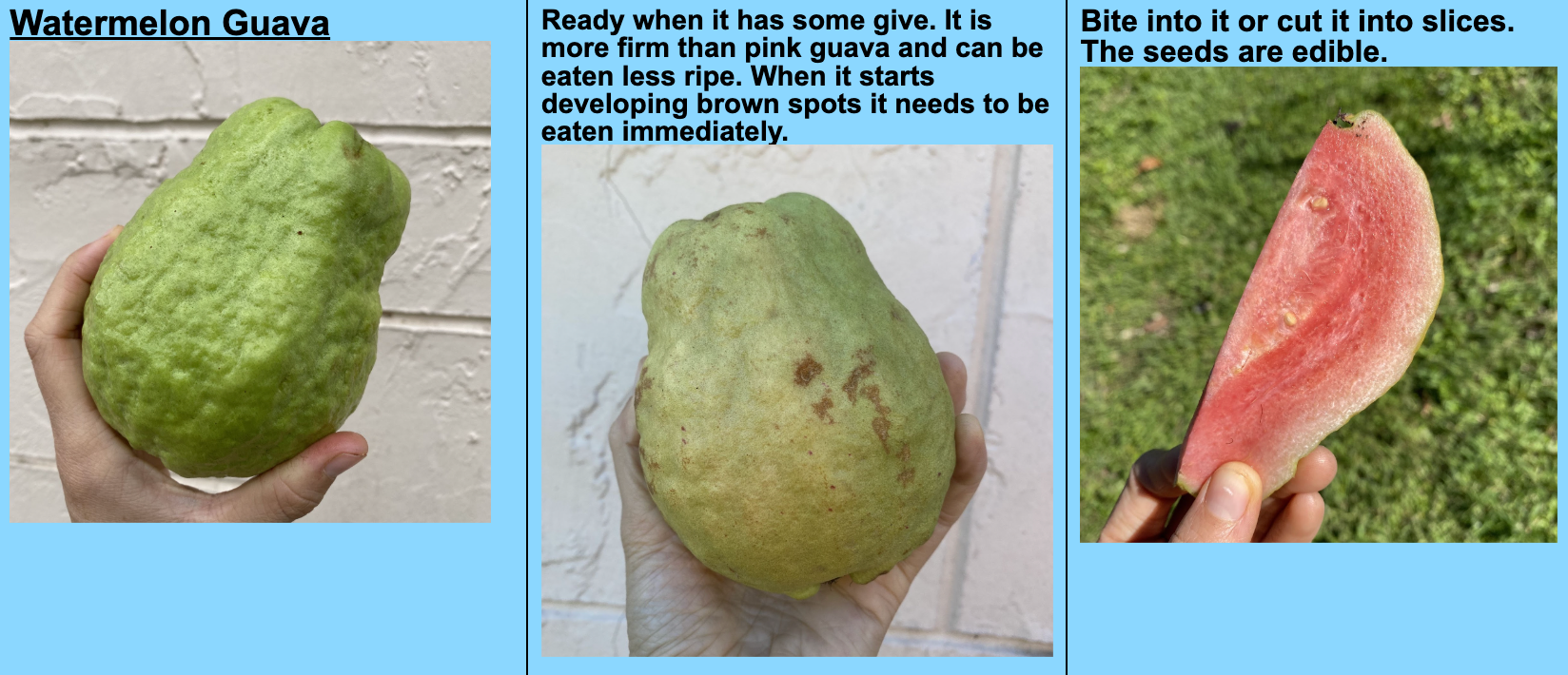 How To Eat: Watermelon Guava is ready to eat when it has some give. It is more firm than pink guava and can be eaten less ripe. When it starts developing brown spots it needs to be eaten immediately. Bite right into it (like an apple) or cut it into slices. The seeds are edible.