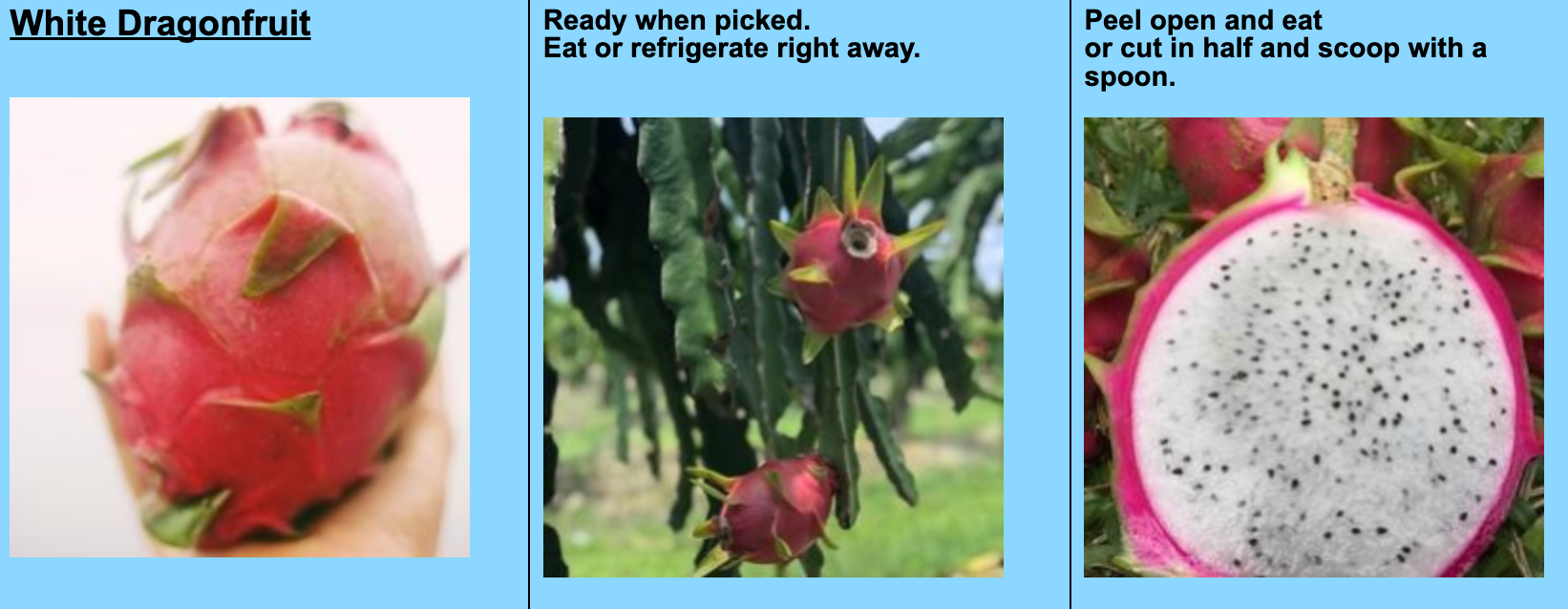 How To Eat: Cut in half or peel away the pink skin and eat the white pulp and black seeds inside. Dragonfruit can also be eaten chilled, frozen, juiced, blended, or used to flavor other beverages.